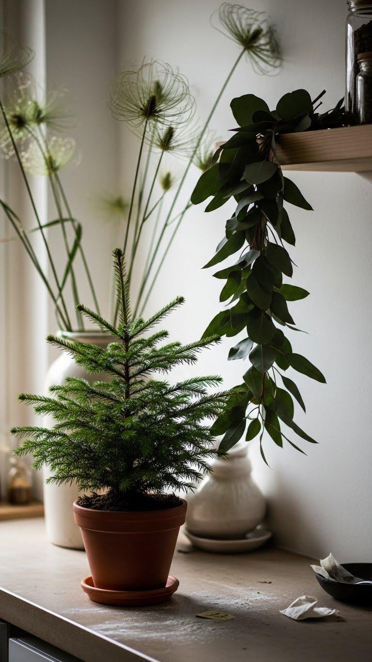 Pair the sculptural drama of dried grasses with the fresh, lived-in look of small potted evergreens and eucalyptus to add life and seasonal scent. Place an evergreen centerpiece on the counter, anchored in a simple pot, and drape a eucalyptus garland along a shelf or windowsill. You’ll enjoy low-maintenance greenery that smells crisp and supports a liberated, unfussy aesthetic.