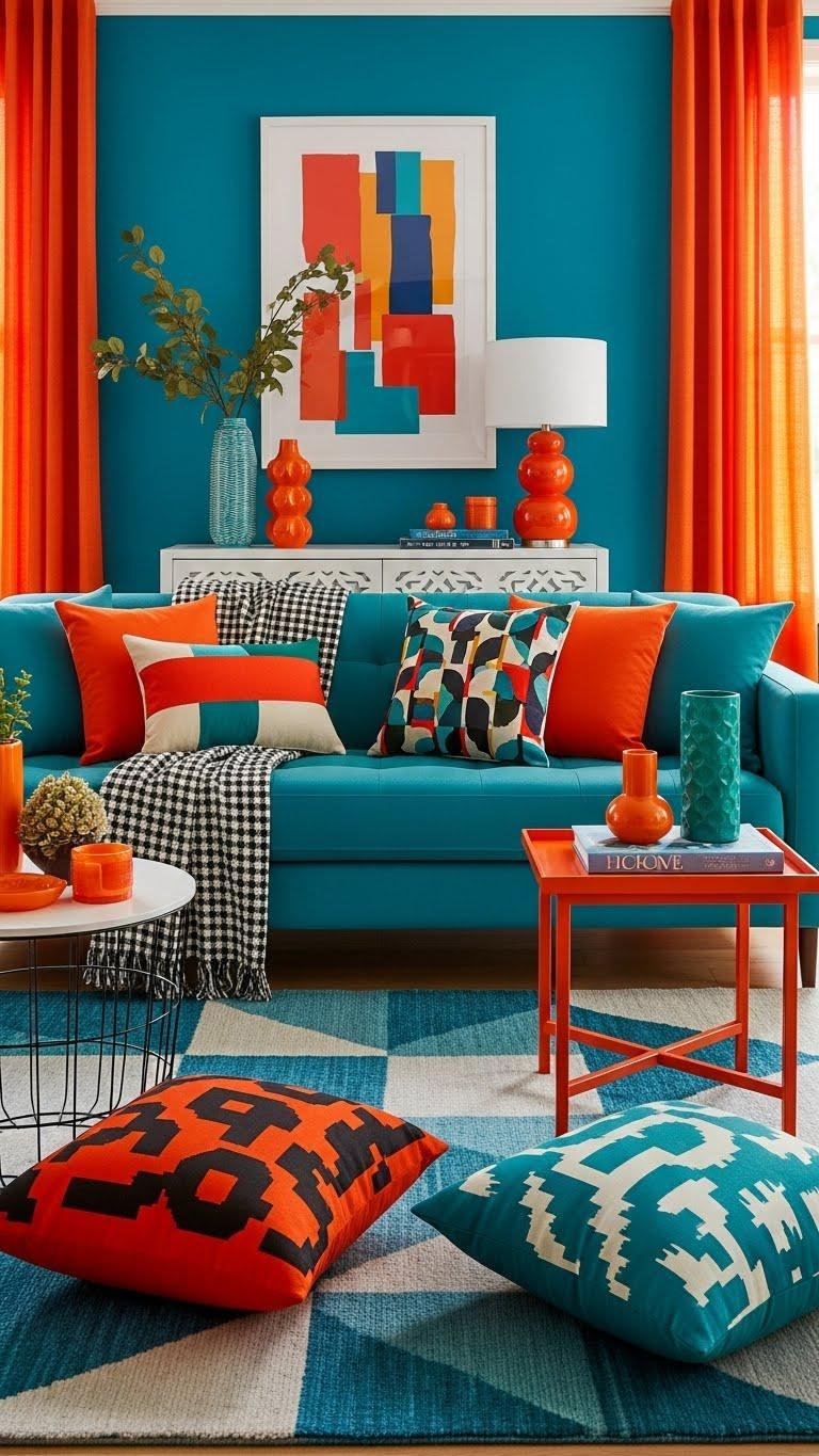 Flip the script on traditional palettes by pairing fiery orange with cool teal for a living room that crackles with energy yet stays grounded. You’ll use high contrast textiles—throw pillows and a statement rug—to anchor the mood.