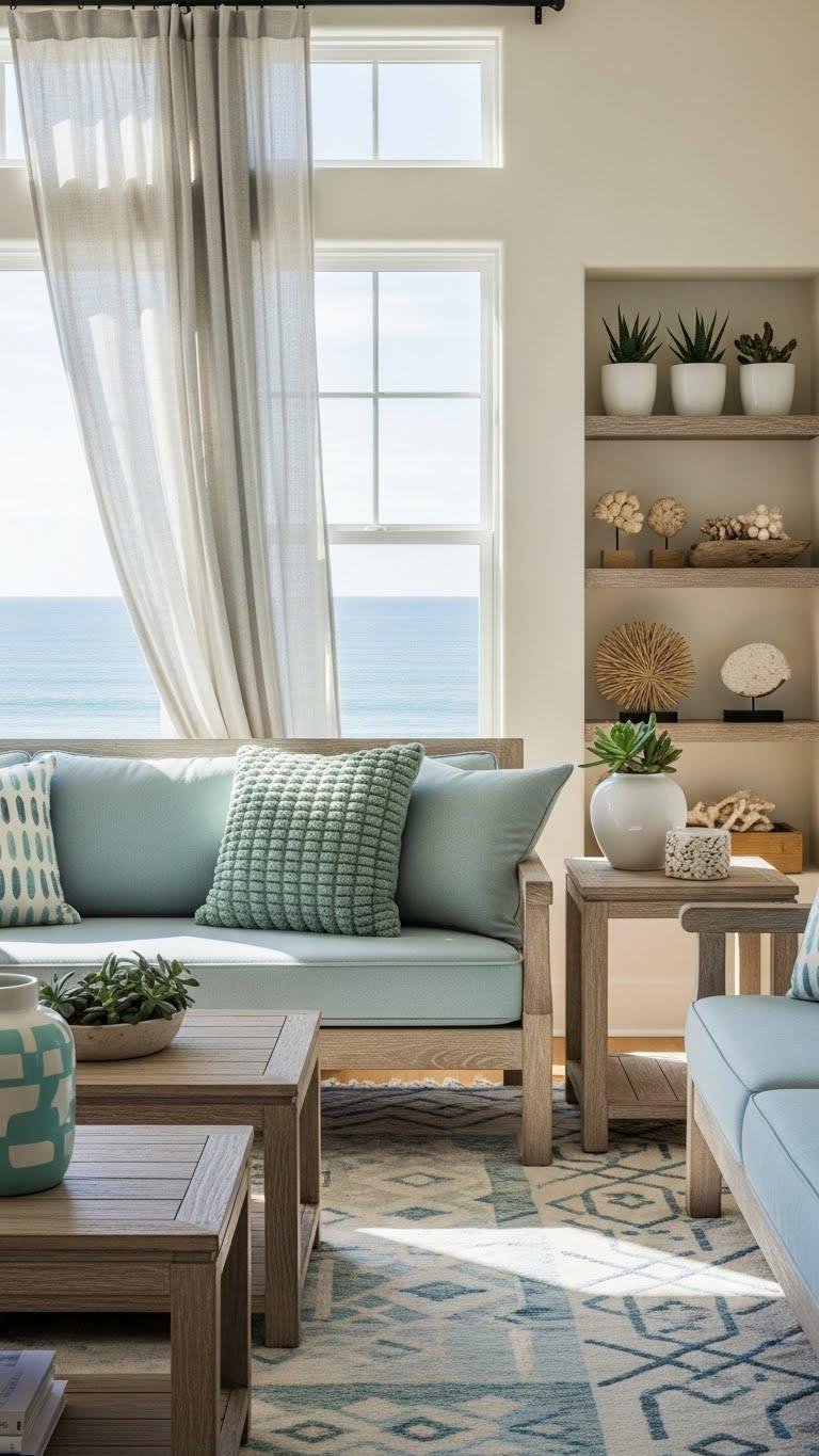 When you trade earthy greens for soft sea-glass blues, the room instantly feels breezier and more relaxed; layer pale blue cushions, linen drapes, and a few weathered-wood pieces to evoke shoreline calm without kitsch.