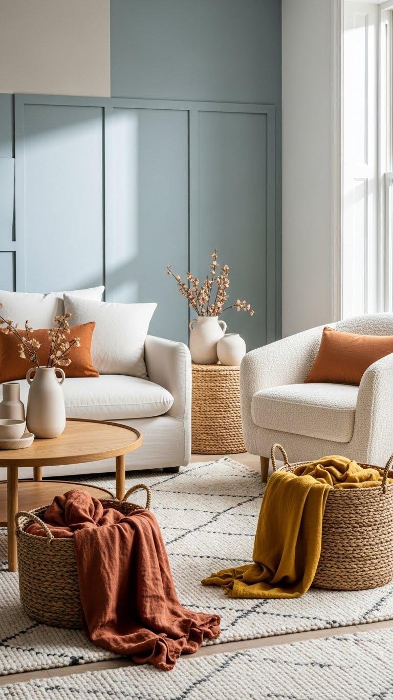 Shifting from sea‑glass blues to cozy hygge, layer textures to make the room feel warm and lived‑in without losing the airy coastal light. You’ll mix tactile wallpanels with soft rugs, woven baskets, and rumpled linen throws.