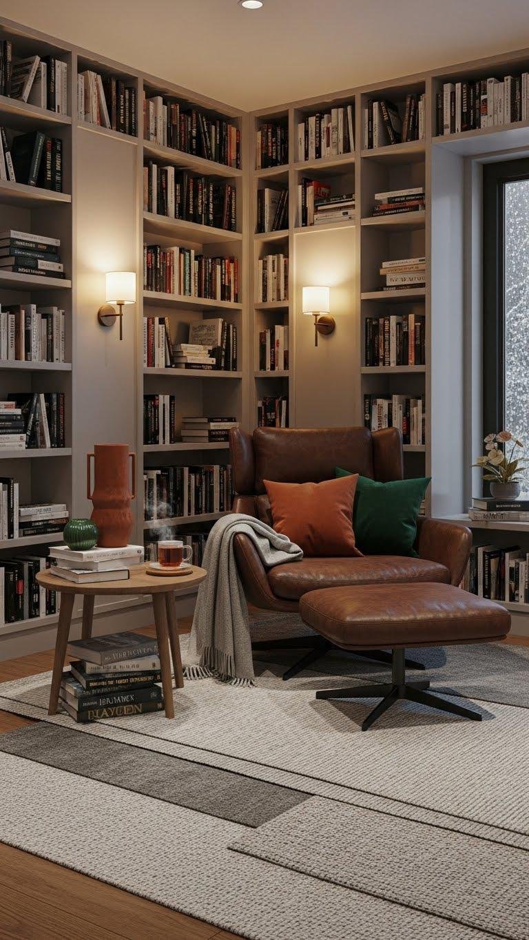 If you want a snug retreat, carve out a corner with a rounded armchair or low daybed, layered throws, and a textured rug to anchor the spot—soft ambient lighting (think dimmable wall sconces, a warm-toned floor lamp, and a tucked LED strip) will set the mood without fighting the room’s main fixtures.