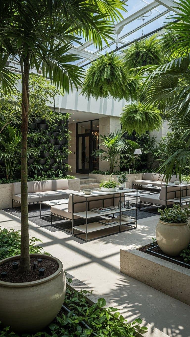 Embrace sunlit biophilia with vertical planters and an indoor canopy of architectural palms and fern collection.