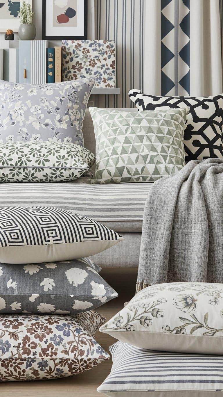 Against a unified color story, mixing patterns gives your living room depth without chaos.
