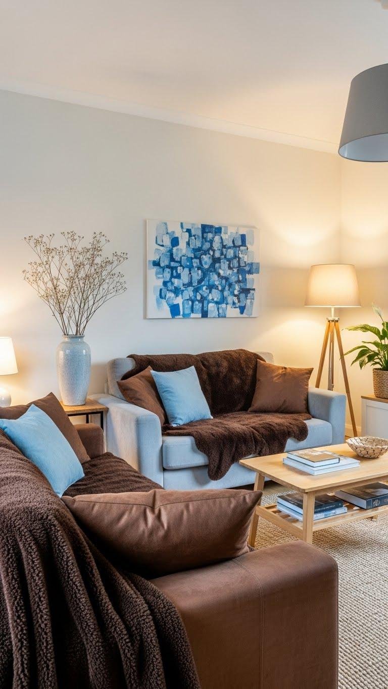 Though grounded in tradition, pairing chocolate brown with soft blue gives your living room a fresh, serene twist that feels both timeless and now.