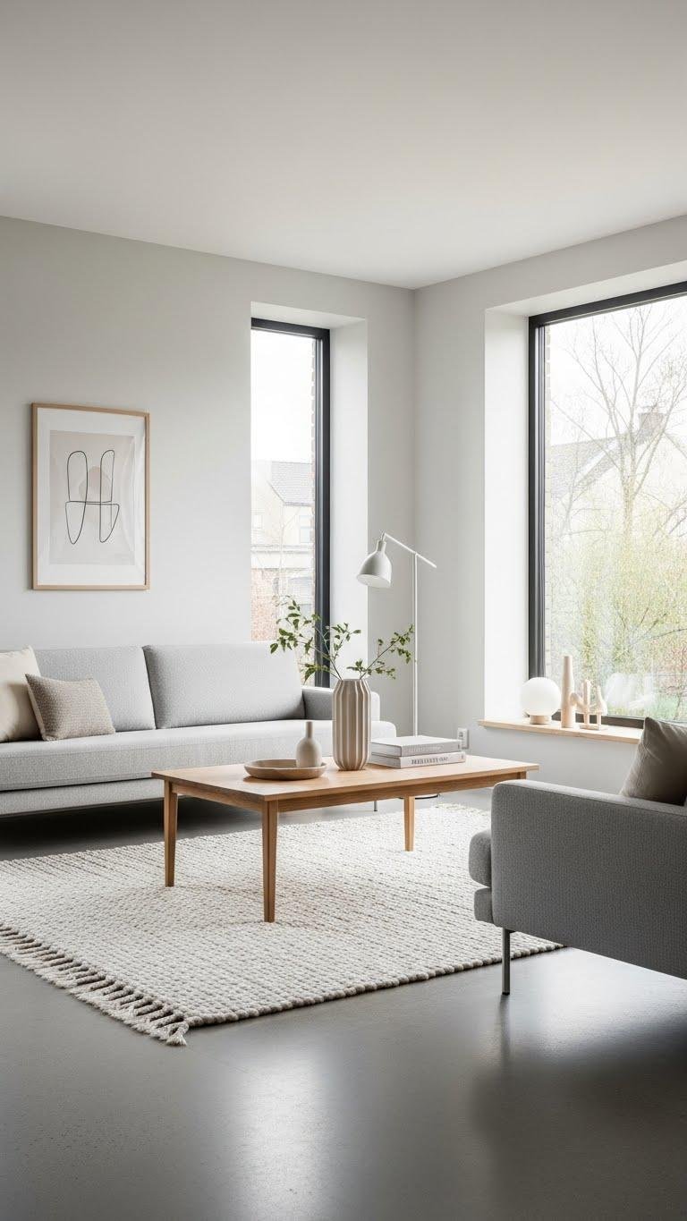 You’ll choose Scandinavian simplicity—neutral palette, natural light, textured rugs—and commit to low‑profile furnishings that keep sightlines open.