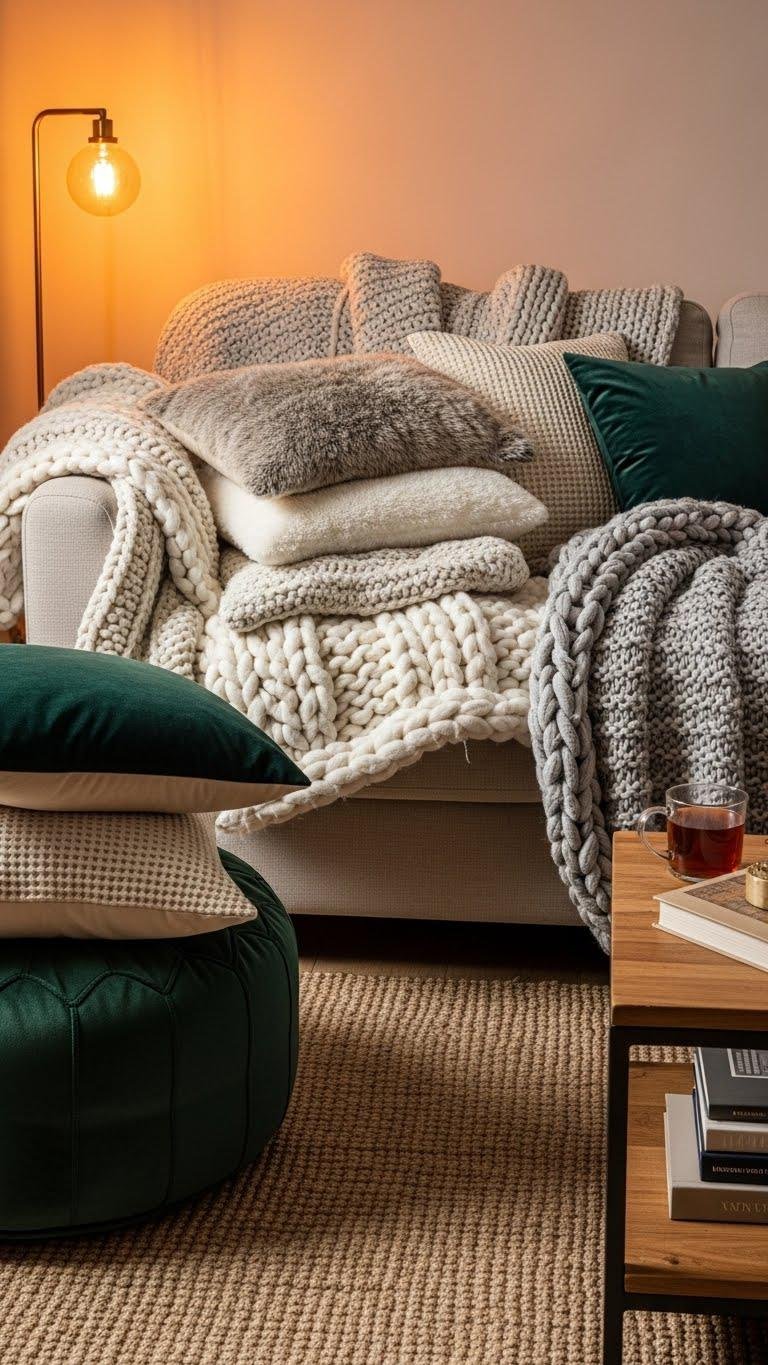 Sink into velvet, faux shearling, and oversized waffle weaves that invite you to linger—mix textures at different scales so throws read like intentional gestures rather than afterthoughts.