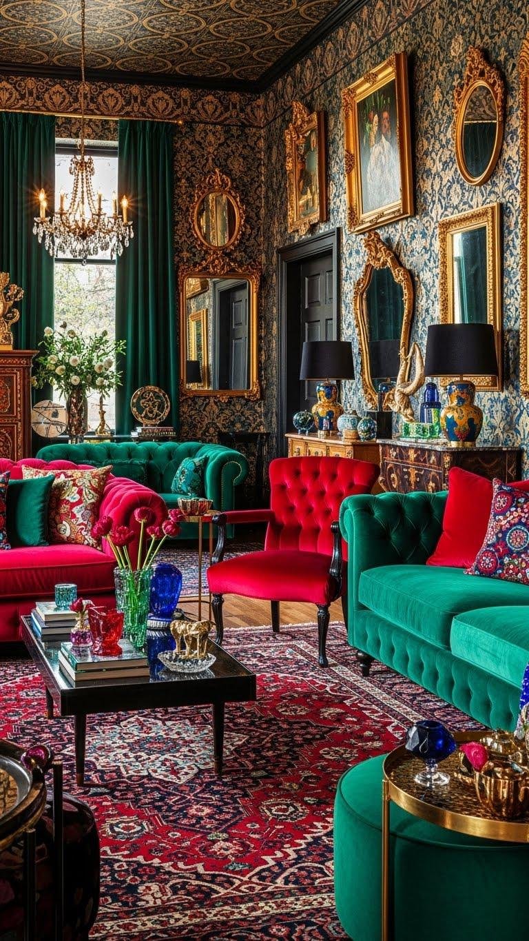 You’ll embrace jewel maximalism with statement layering: mix emerald velvet, ruby accents, and sapphire rugs, pair gilt mirrors and patterned wallpapers, and keep pieces deliberate so your bold, liberated space feels collected not chaotic.