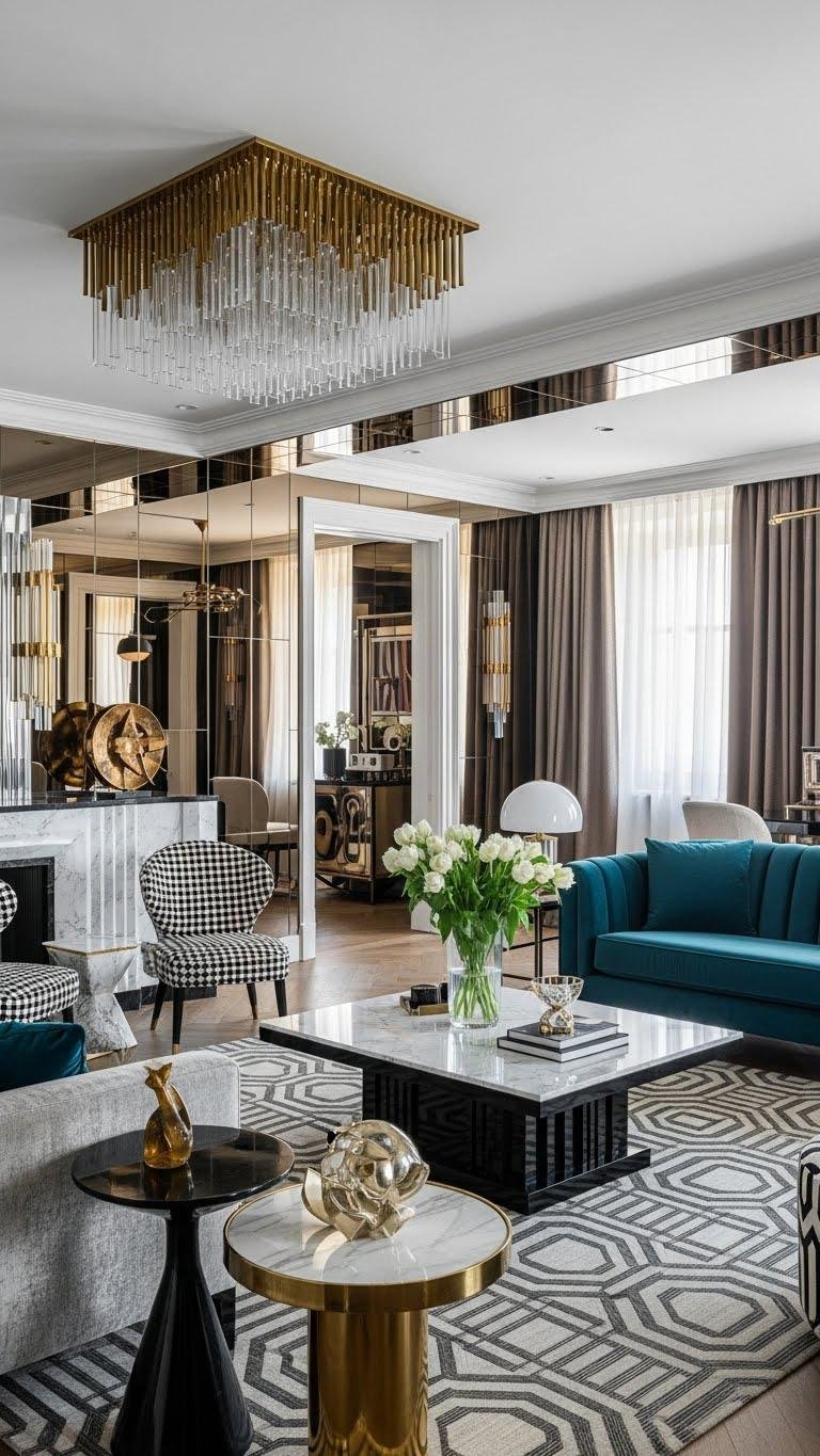 Geometry and gleam define an Art Deco glam living space, where bold symmetry meets luxe materials to create a confident, cinematic room.