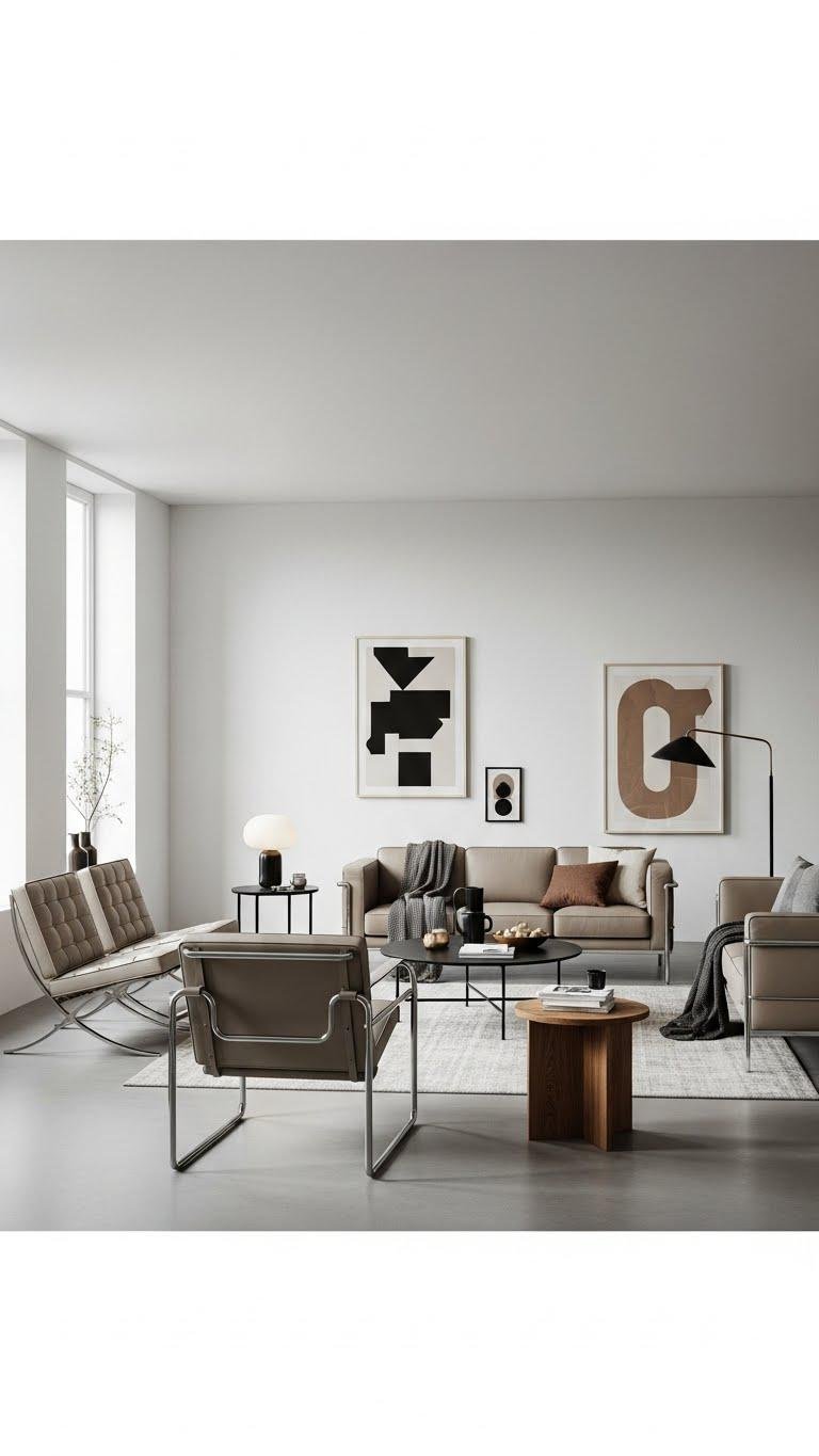 Center a clean-lined seating group that reads like a modernist sculpture: think tubular steel frames, cantilevered chairs, and a low-profile sofa in neutral leather or matte upholstery that anchors the room without fuss.