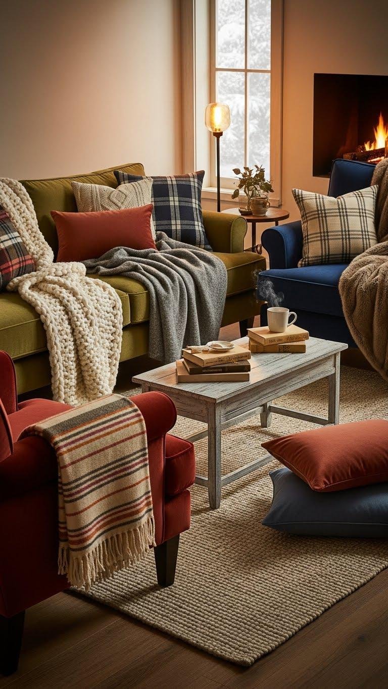 Start by draping a couple of plush blankets over your sofa and armchairs to instantly soften seating and add visual warmth. Layer textures: toss a knit throw over velveteen armchairs, fold a wool blanket on plush ottomans, and mix weights for seasonless comfort. You’ll create a relaxed, free-feeling room that invites lounging, reading, and effortless retreat without fuss.