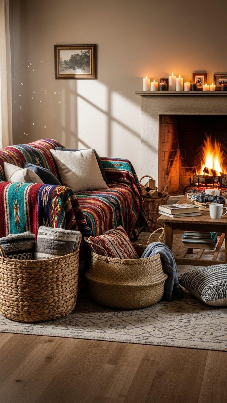 After draping blankets on seating, corral extras in woven baskets so they’re ready when someone wants to curl up. You’ll arrange throws and pillows by color and texture in woven storage for easy grab-and-go comfort. Place baskets near seating or beside a fireplace for instant warmth.