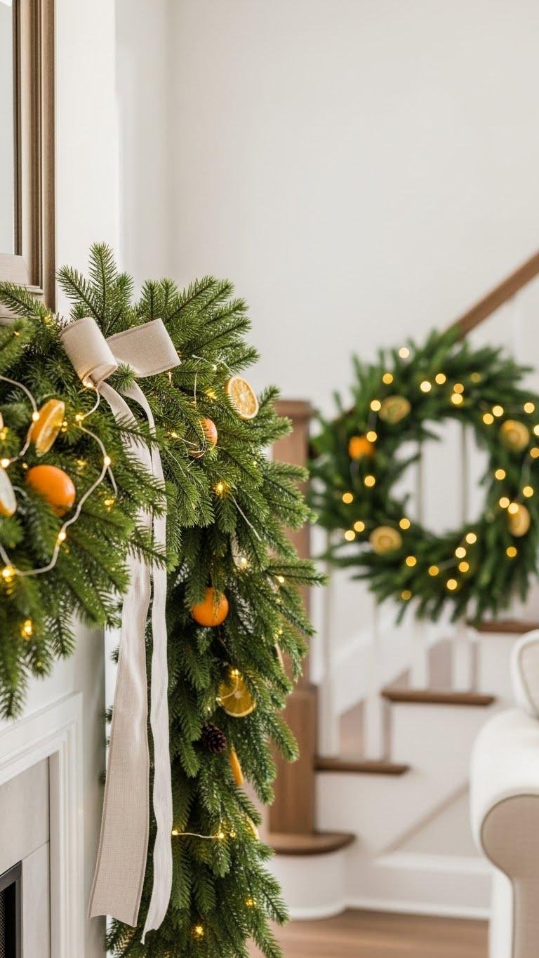 You’ll trim, reshape, and combine upcycled garlands with simple accents—linen ribbon, string lights, or citrus slices—to refresh without buying new. Swap a matching evergreen wreaths, hang sparsely, and let natural texture set a liberated, relaxed mood.