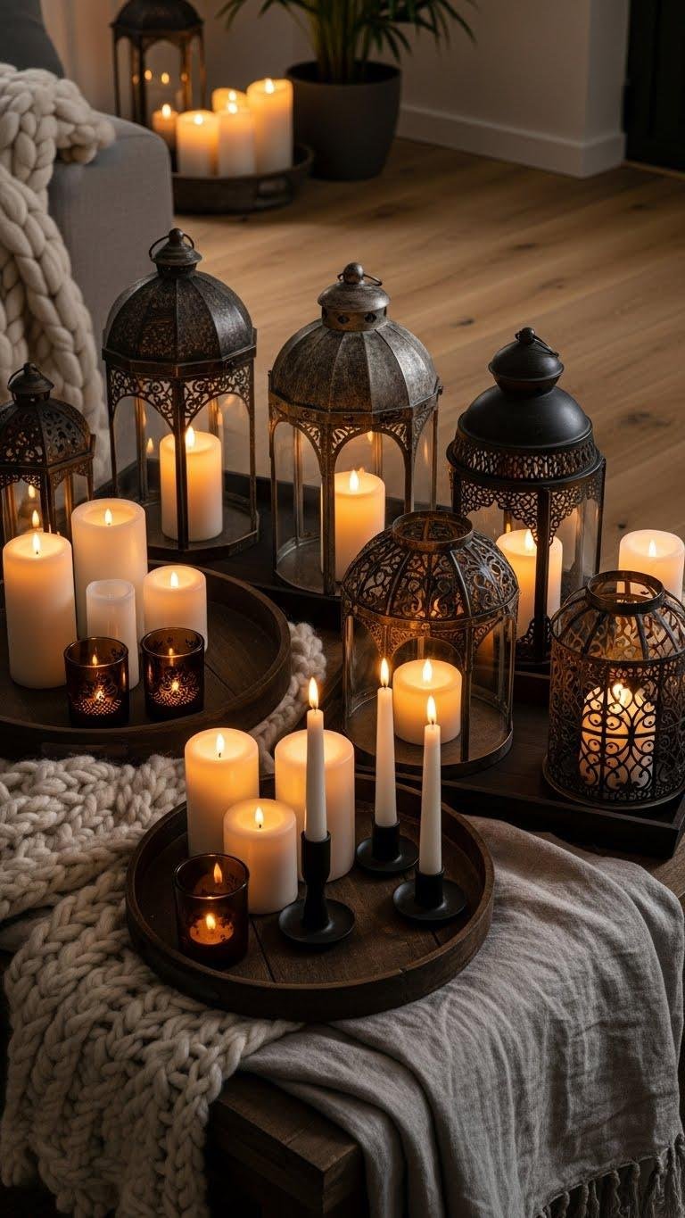 Against a backdrop of neutral textiles and raw wood, group candles and lanterns to create pockets of warm, low light that invite lingering. You’ll arrange scented waxplays in clusters on trays, mixing heights and textures for depth. Place metal lanterns nearby to add structure and breeze protection. Keep clear walkways, trim wicks, and rotate scents so the room feels free, calm, and intentional.