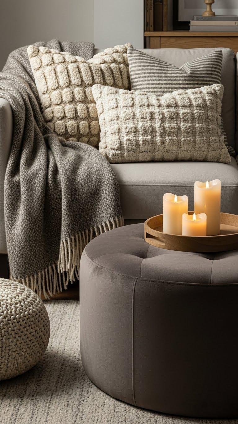 After the soft glow of battery candles sets the mood, bring tactile warmth into the room with layered textures like bouclé, velvet, and wool. Mix bouclé throwpillows on a relaxed sofa, drape a rustic wool blanket, and add a velvet ottoman as a focal perch. Keep colors muted, contrast textures, and let each piece invite you to sink in and roam freely.