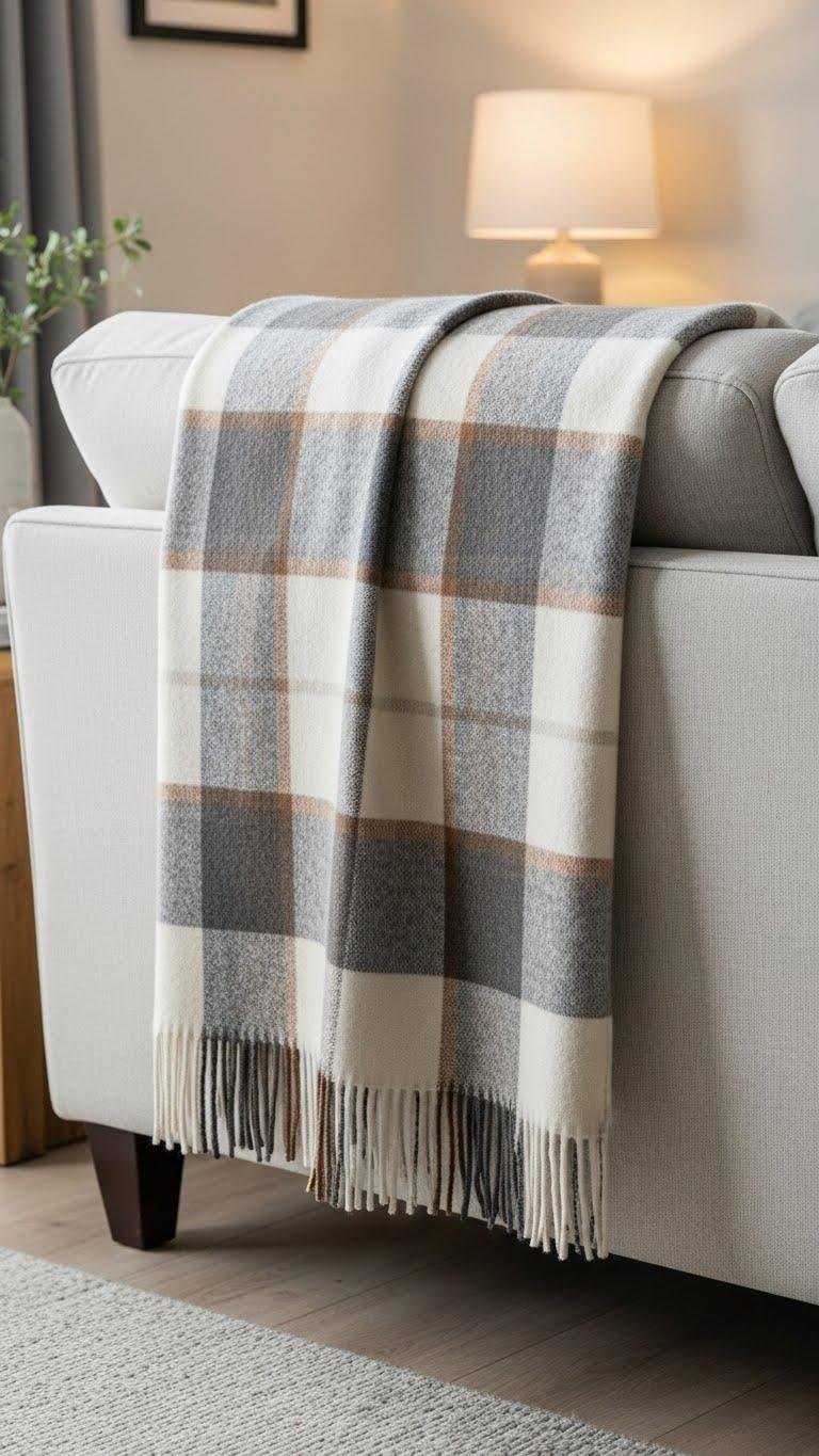 Drape a neutral plaid throw over the back of your sofa or the arm of your favorite chair to instantly add classic warmth and quiet patterning to the room. You’ll embrace plaid layering without overpowering other elements, mixing muted creams, greys, and soft browns.