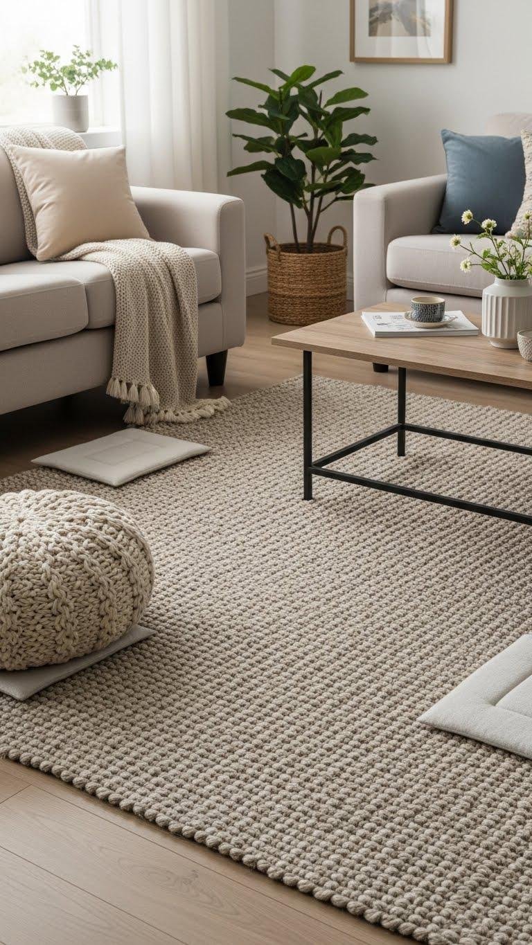 A thick wool rug grounds the seating area and gives your feet a soft, warm landing the moment you step into the room. Choose a dense pile with hand knit texture for tactile comfort and visual depth.