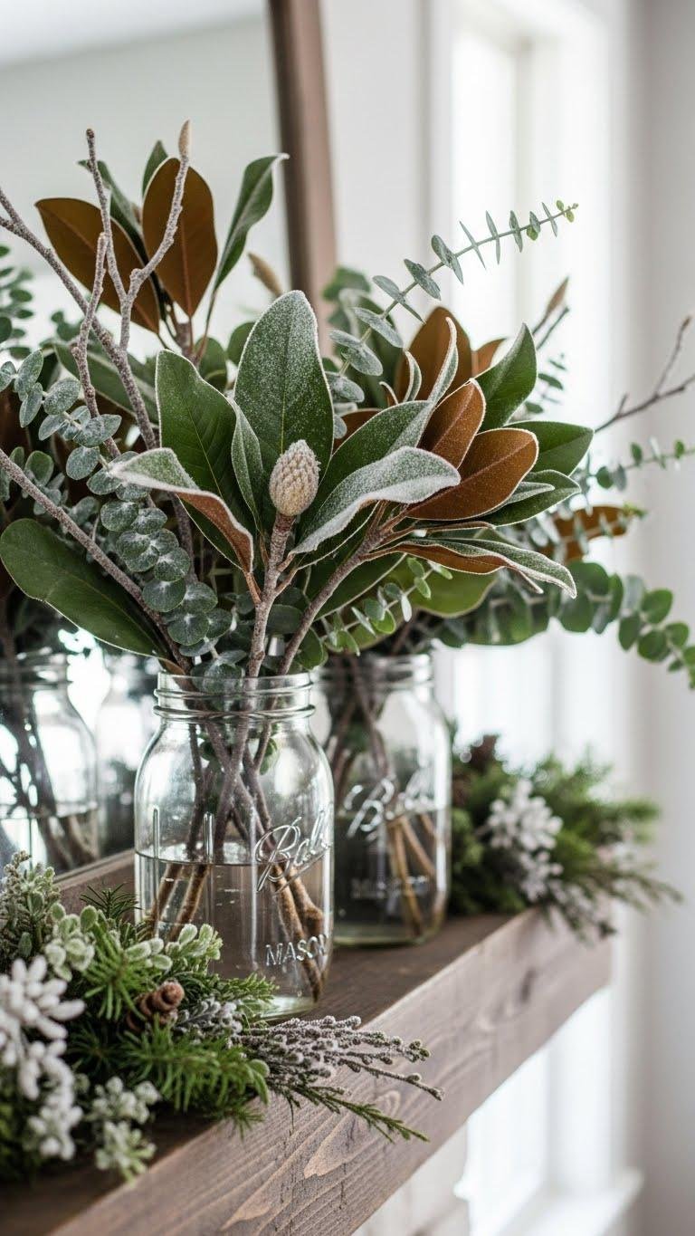 Bring leftover holiday greens back to life by trimming them into fresh arrangements and pairing them with snow-dusted stems for an easy, wintry look. You’ll tuck foraged eucalyptus into mason jars, clip frosted magnolia branches, and mix textures for contrast.