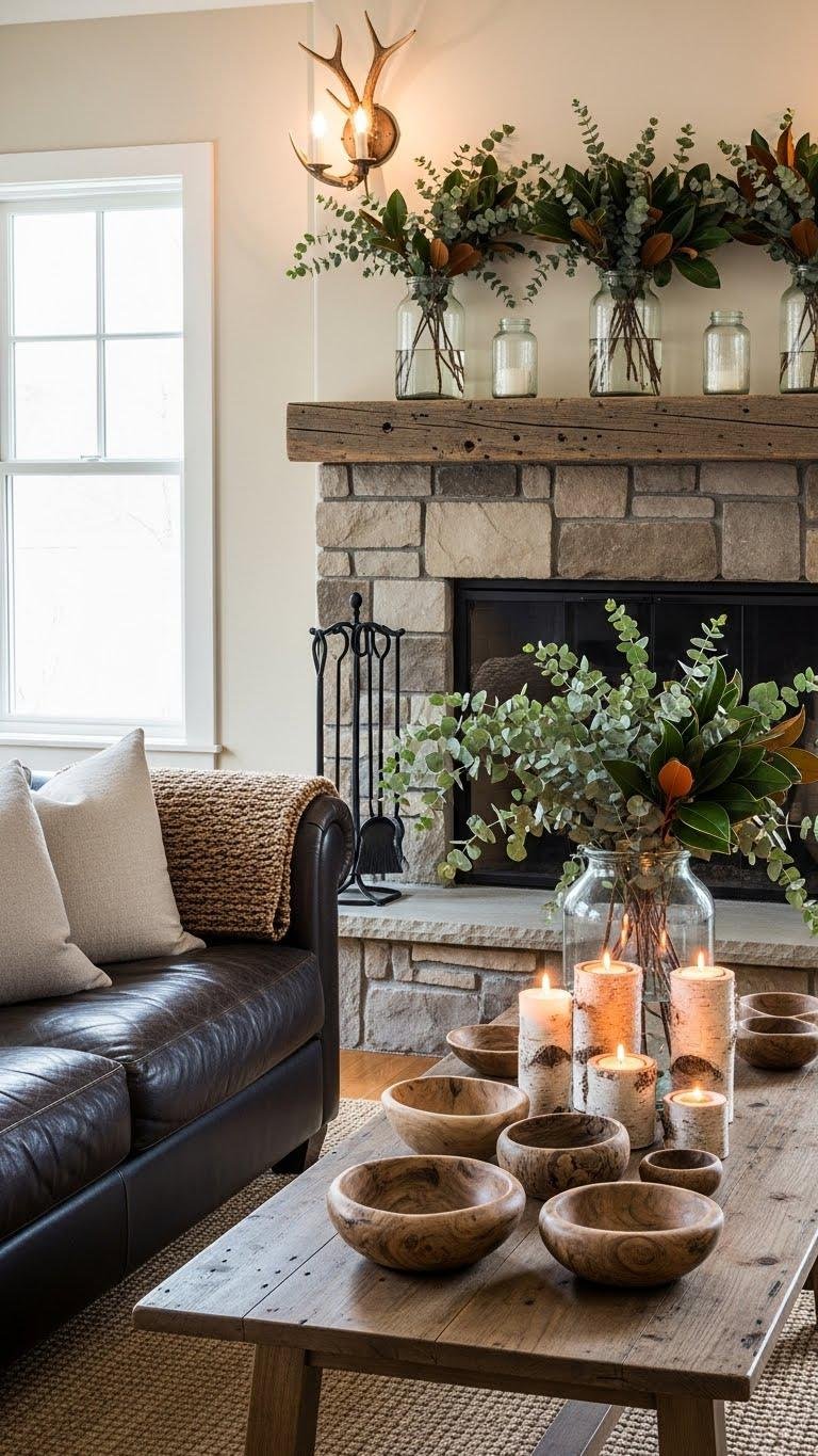 After you’ve freshened up jars of eucalyptus and frosted magnolia, layer in antlers and other natural accents to add rustic weight and sculptural interest. You’ll place antler sconces above a reclaimed mantel, mix small driftwood bowls, and set birch candleholders on a coffee table. Keep lines clean, materials honest, and let each piece breathe so your space feels free and grounded.