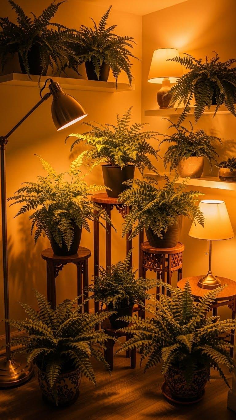 Place potted ferns at varied heights—on stands, shelves, and corners—so light sculpts their fronds. You get a calm, open feel that invites movement and relaxation without feeling staged.