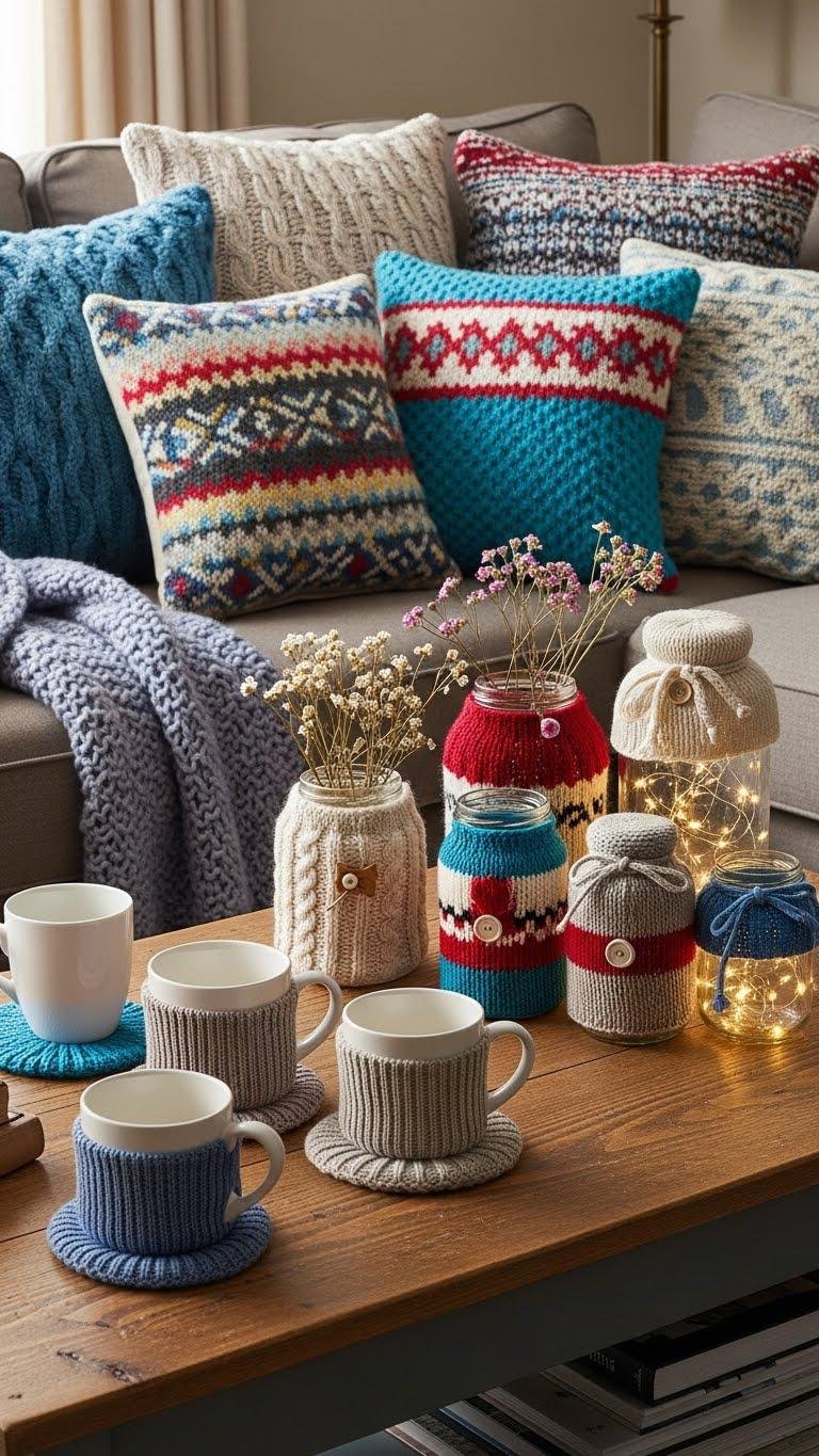 Give old sweaters new life by turning them into soft pillow covers and charming jar cozies you’ll actually use; the knit textures add instant warmth and personality to your living room.