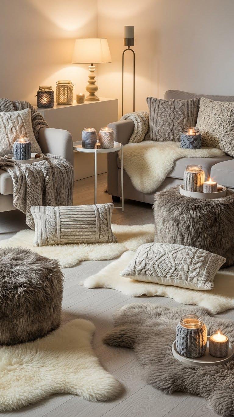 Once your living room wears the soft, handmade look of sweater pillows and jar cozies, add sheepskin rugs and faux fur accents to amplify that tactile warmth. You’ll use sheepskin layering on chairs and rugs for cozy zones, and pick faux fur ottomans as movable warmth and texture. Keep colors neutral, shapes simple, and let touch guide placement for relaxed, free living.