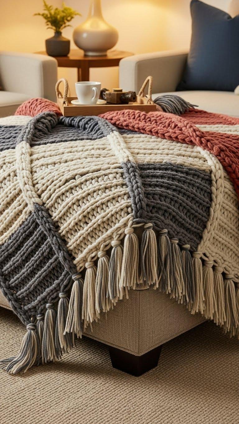 You’ll mix hand stitched panels with color blocked sections, choose alpaca blends for warmth, and let textured fringe tumble casually. Tuck corners for a lived-in, free-spirited look.