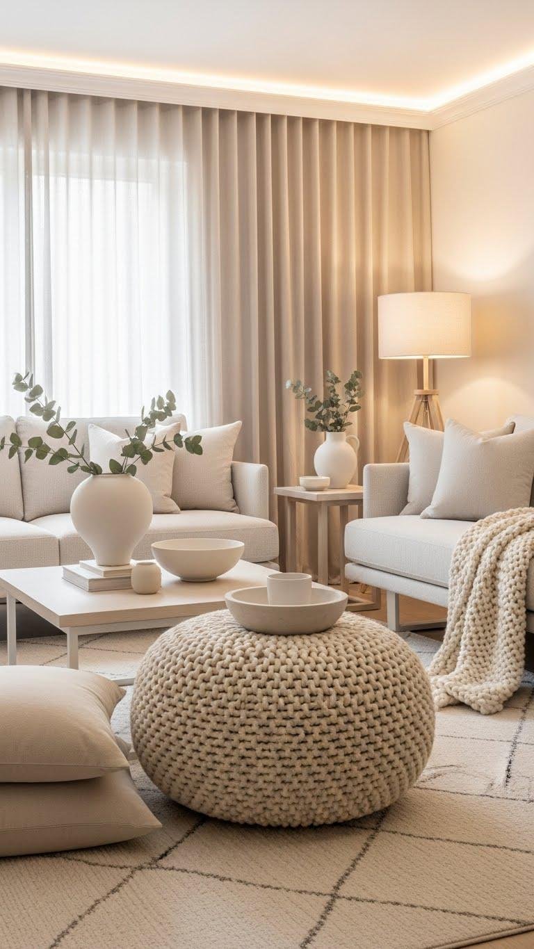 After softening your ottoman with a chunky knit, calm the room further by layering a neutral white palette that feels warm, not stark. Choose soft linen drapes, muted cream pillows, and a low-profile rug to keep sightlines open. Add matte ceramics, pale wood accents, and gentle lighting so you can move freely, relax, and let the space breathe without heavy contrast.