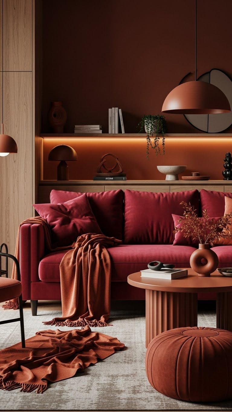 Choose a velvet crimson sofa as anchor, add burnt sienna throws and matte terracotta accents. Layer in warm wood, low light, and mixed textures so you can relax or host boldly. Keep patterns minimal to let color do the dramatic, freeing work.