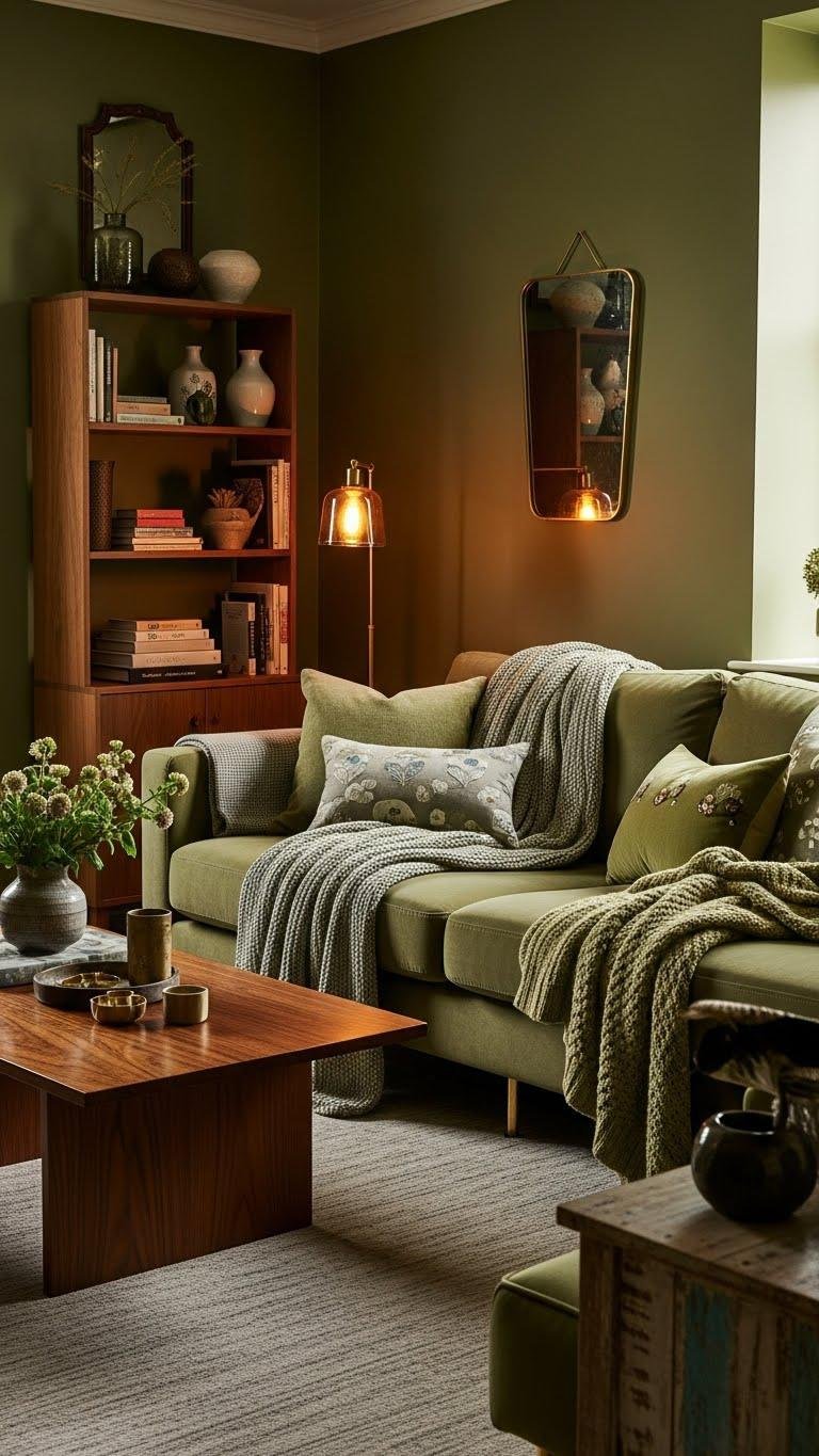 You’ll lean into olive undertones on walls, mix mossy textiles for sofas and throws, and balance with warm wood and brass.