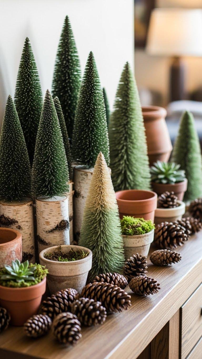 After you’ve grounded a mantel or table with pine cones and birch logs, introduce small rustic pine trees and bottle brush displays to add vertical interest and a touch of whimsy. Place clustered miniature firs in varied heights on trays, tuck vintage bottlebrushes between logs, and mix in weathered pots. You’ll create a relaxed, liberated vignette that feels intentionally simple and alive.