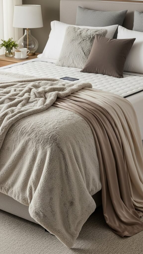 You’ll pair it with a faux silk throw for contrast and tuck a heated mattress pad beneath fitted sheets; these choices keep your sanctuary sleek, liberated, and reliably cozy.