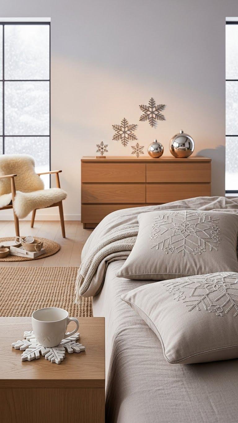 Bring in snowflake motifs through small accents to give your bedroom a crisp, wintry edge without overwhelming the space. You’ll add personality with snowflake coasters on bedside tables, embroidered snowflakes on throw pillows, and subtle metallic ornaments on a dresser. Choose minimalist designs and natural textures to keep the look modern and liberating, balancing pattern with calm, open surfaces for true seasonal elegance.