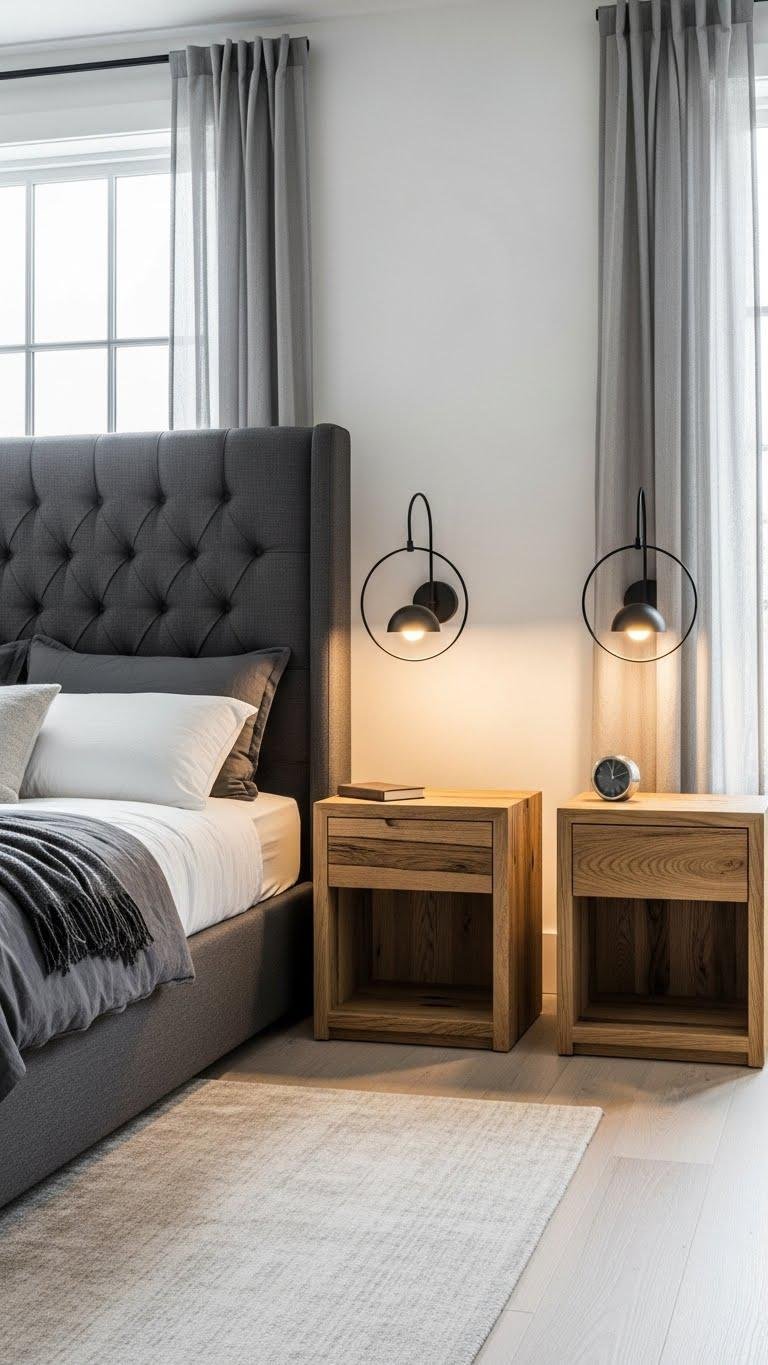 After anchoring the bed with a tufted dark gray headboard, pair it with wood nightstands to introduce a quiet, rustic serenity that balances the room’s tailored feel. Choose reclaimed oak pieces with clean lines and a protective minimalist lacquer finish. You’ll create functional warmth—ample surface, smart storage, tactile grain—that grounds the space while keeping your aesthetic free, modern, and intentionally composed.