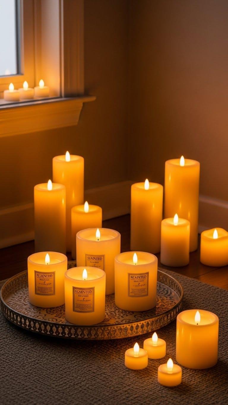 You’ll layer scented votives on trays, group varying heights, and tuck battery tealights into corners for flicker without worry.