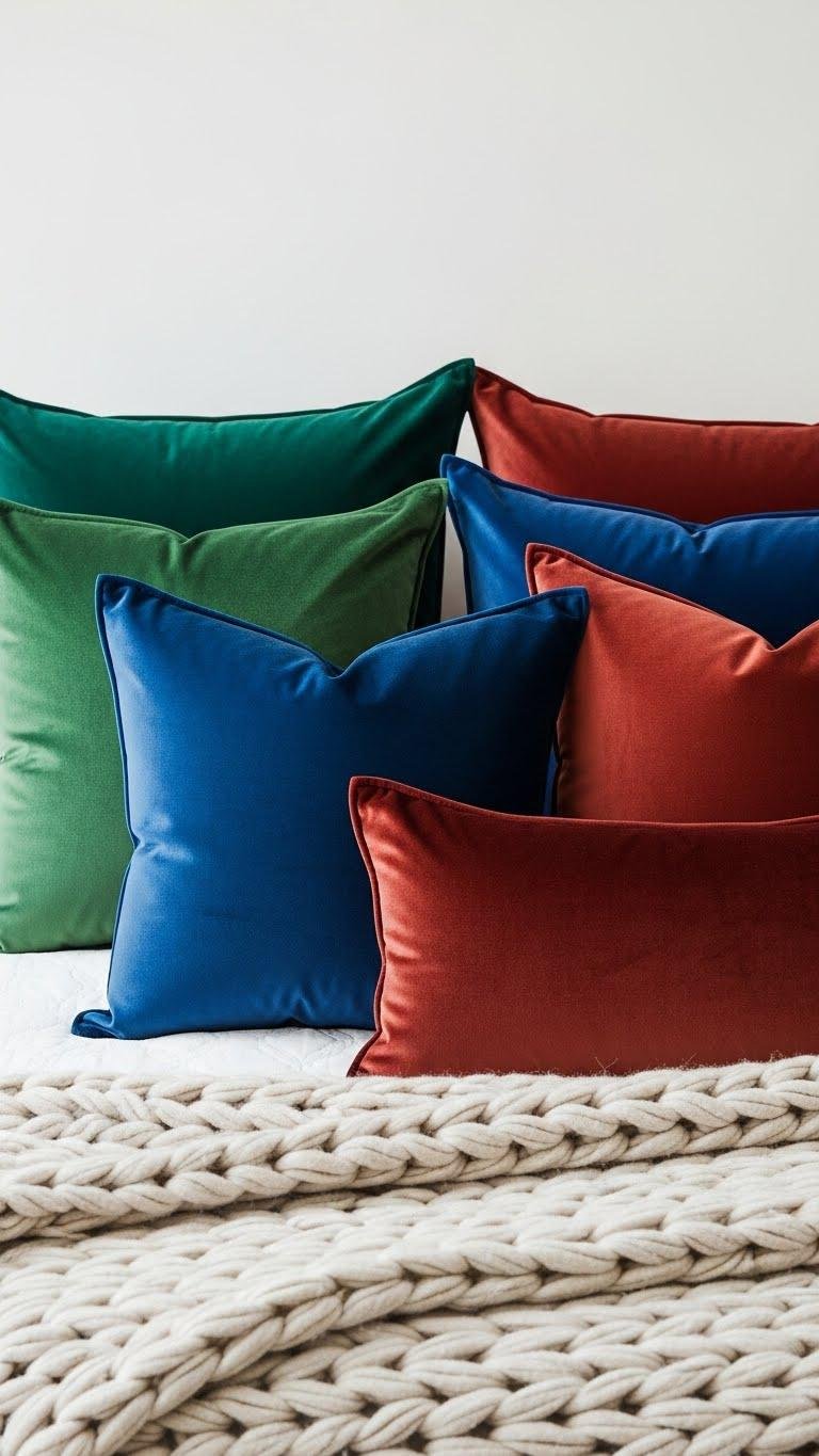 Pairing a chunky knit blanket with velvet pillows amps the tactile story of your bed while keeping the look refined. You’ll mix cream contrasts with jewel tones—emerald, sapphire, garnet—for bold, liberated elegance. Arrange pillows with deliberate velvet draping, alternating sizes and shapes to create depth. Choose dense fills and neat seams so each piece looks curated, modern, and effortlessly plush.