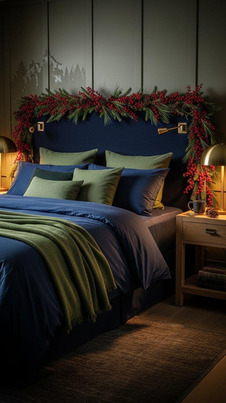 After you’ve finished layering berry garlands along the headboard, anchor the room’s mood with a palette of rich blues and forest greens to evoke a modern chalet feel. You’ll choose a cohesive chalet palette, pairing deep navy linens, mossy throws, and matte green pillows. Introduce subtle alpine accents—brass hardware, timber bedside lamps—to keep the look refined, free, and unmistakably cozy.