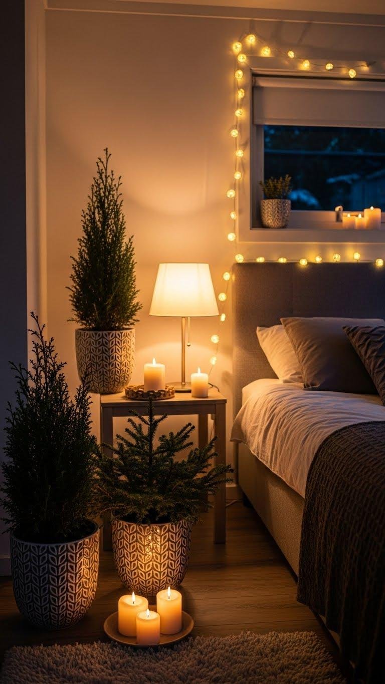 The soft glow from patterned planters and evergreens deserves equally thoughtful lighting; layering lamps, fairy lights, and candles will give your chalet bedroom depth and mood without competing with that fresh, natural vignette.
