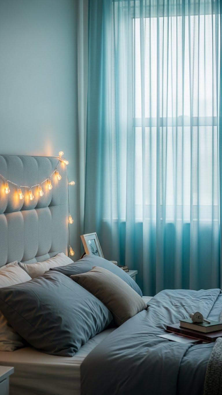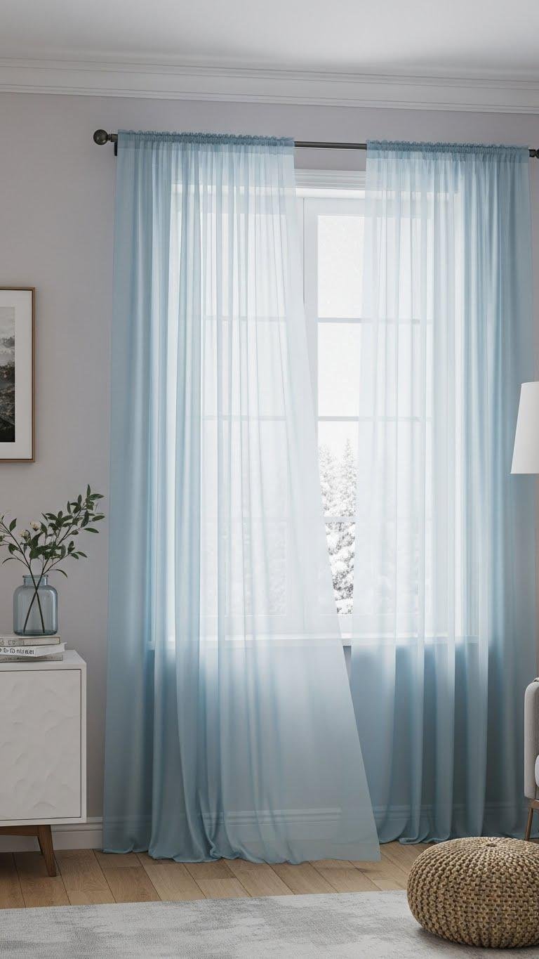 With a sheer pastel blue curtain hung at the window, you’ll soften incoming light into a cool, calming wash that instantly calms the room and flatters winter skin tones. Choose translucent fabric for soft filtering and an airy texture; hang higher and wider to amplify daylight and create visual freedom.
