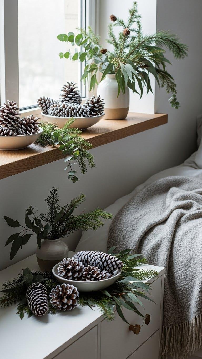 A few frosted pinecones and a handful of seasonal greenery can instantly anchor your winter bedroom scheme, bringing texture and a subtle, natural scent without overpowering the calm. Place frosted pinecones in shallow ceramic bowls, tuck seasonal greenery along a windowsill or dresser, and choose muted tones.