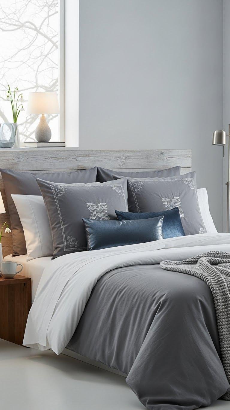 Introduce metallic accent pillows to quietly lift your bedroom’s winter palette—softer than mirror-bright, they reflect light and add depth without shouting for attention. Choose pieces with subtle metallic embroidery and clean satin piping to balance shine and tactile calm.