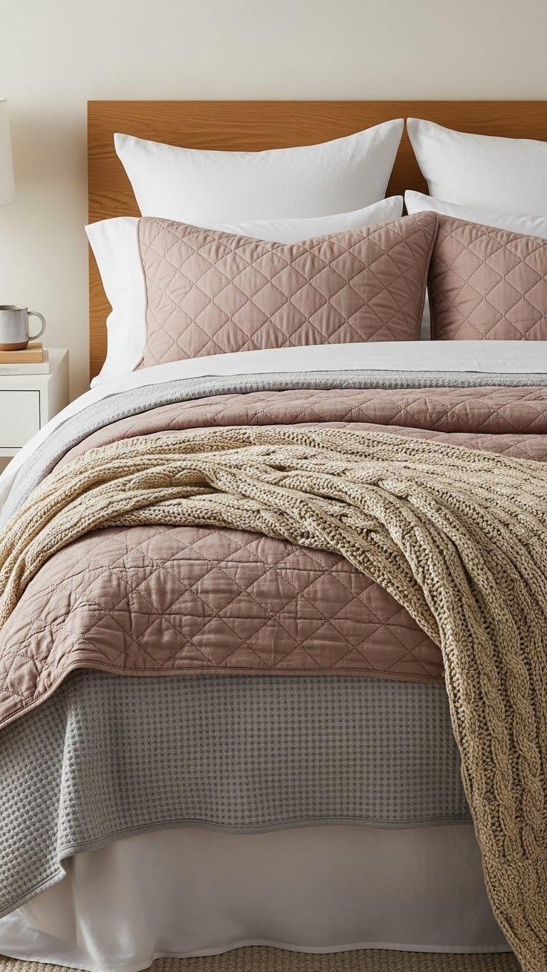 You’ll stack a lightweight quilt, a chunky throw and a thermal underblanket for hidden warmth, then anchor the look with quilted shams. Mix weights, lengths and muted patterns to create freedom-filled, modern coziness that reads curated, not cluttered.
