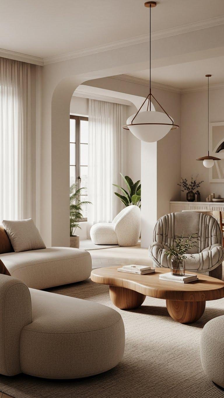 Curved organic furniture brings a softer, modern silhouette to your apartment—think rounded sofas, sculptural chairs, and fluid coffee tables that invite touch and movement.
