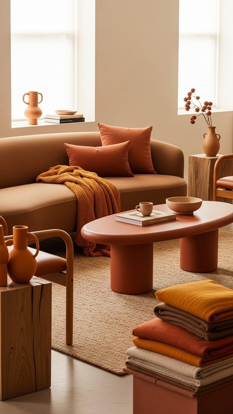 After you introduce rounded silhouettes, layer warm earth tones to root that softness—think terracotta, ochre, warm taupe, and sun-baked sienna against your curved sofa and pebble table.