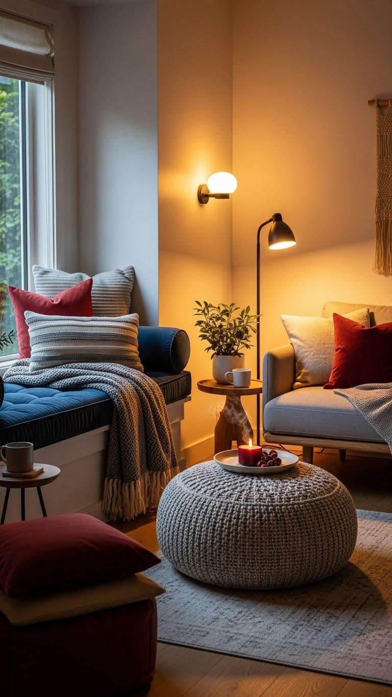 After a punch of indigo or cranberry, you’ll want corners that invite lingering—create a cozy nook with plush upholstery to make that happen. Choose a plush windowseat layered with textured throws, pair it with a low-profile sofa and a tufted pouf for flexible seating.