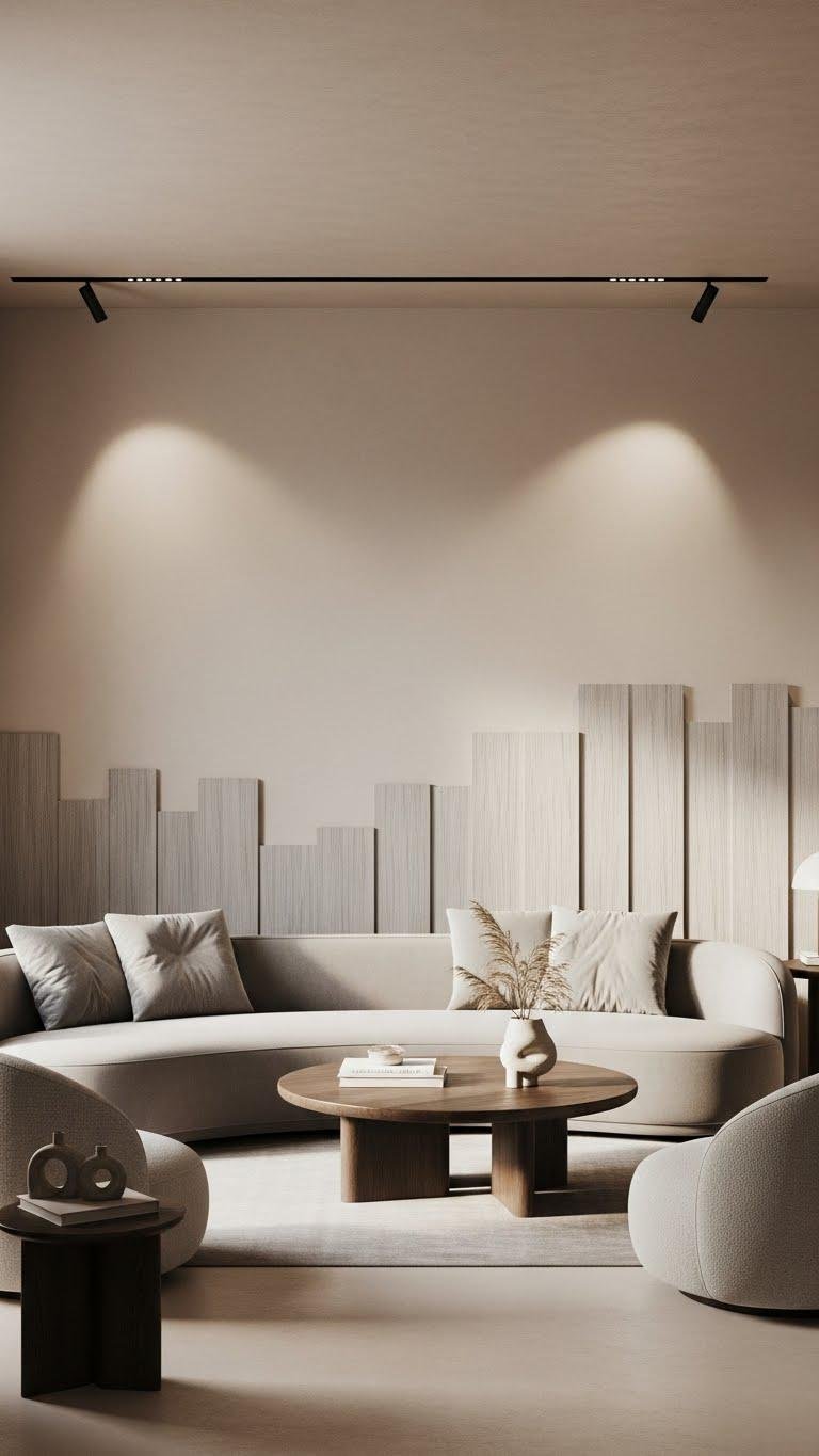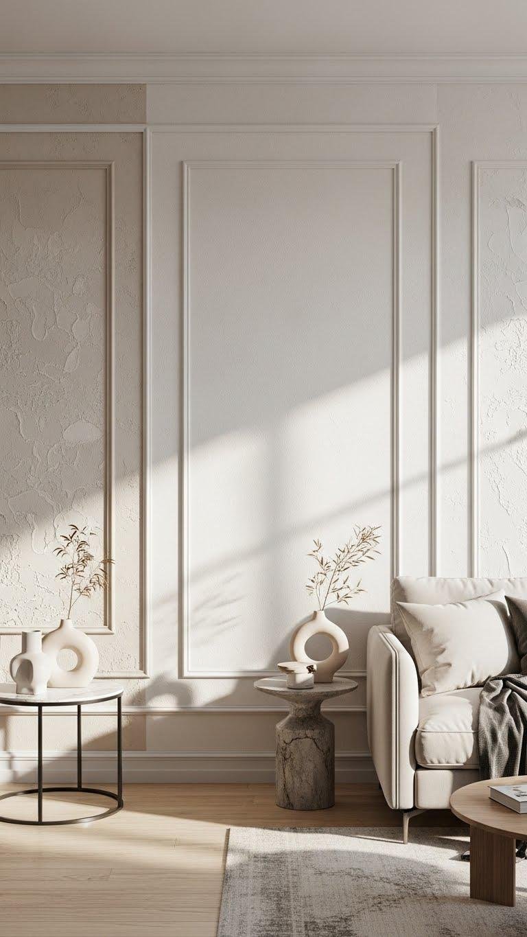 Pick subtle neutrals, sculptural finishes, and directional light to highlight surface. The look feels modern yet free — tactile, calm, and effortless, letting furniture and negative space breathe.