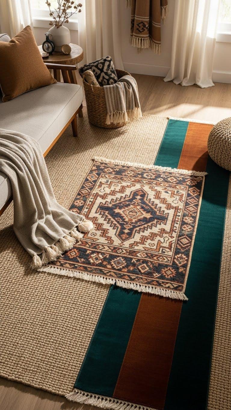 Layer rugs and textiles to instantly add depth and warmth without crowding your floor plan: start with a large, neutral base rug to anchor the room, then layer a smaller patterned or textured rug off-center to create movement and define seating areas.