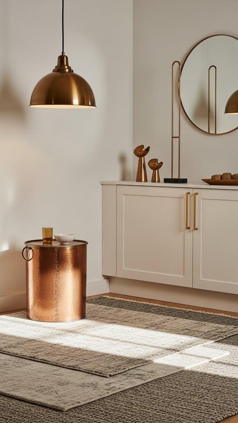 To balance the softness of layered rugs, bring in warm metallic finishes to catch light and add polish. You’ll mix brushed brass fixtures, antique copper accents, and sleek mirrors to create warmth without clutter.