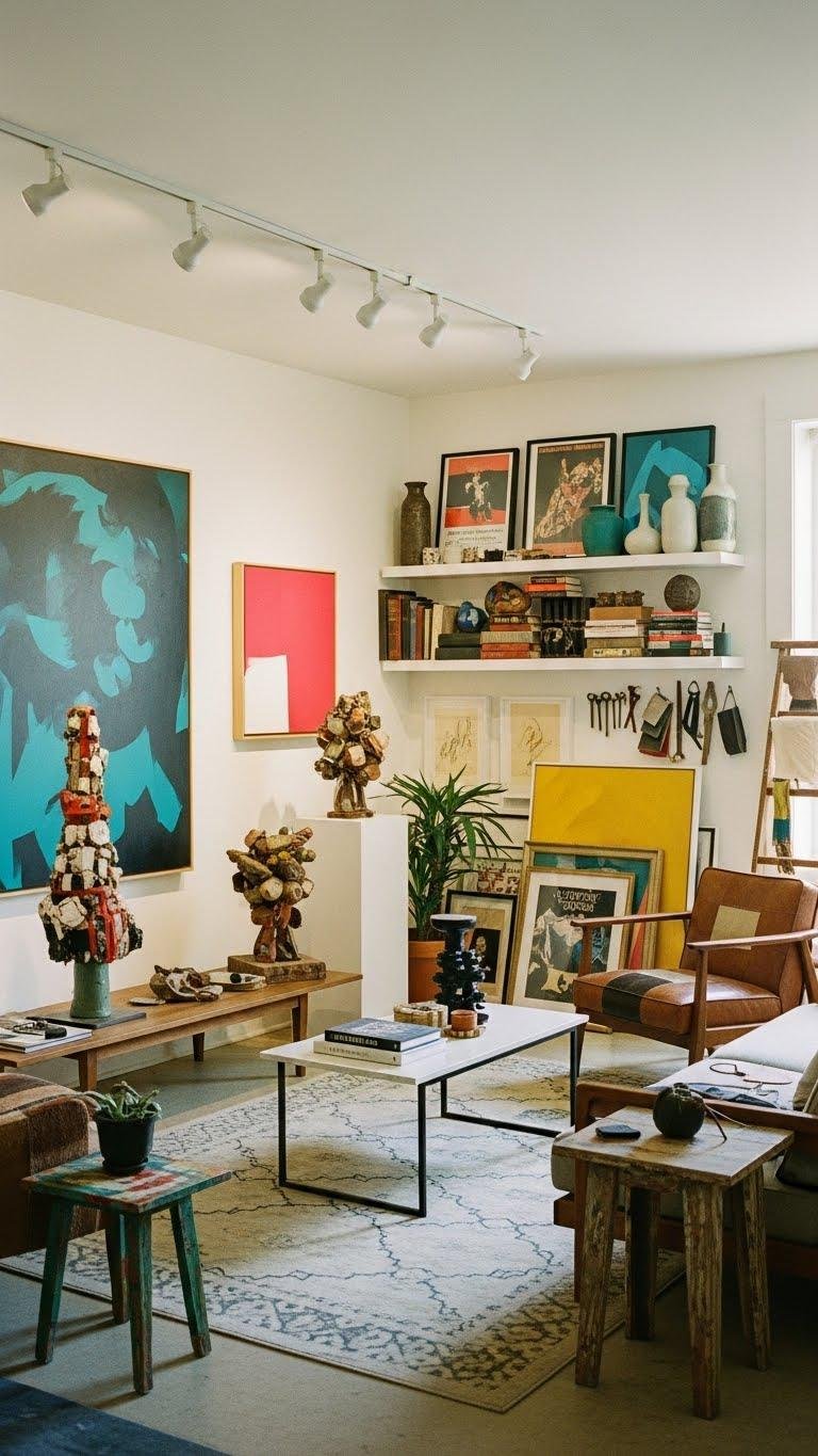 Mix in bold art and found objects to give your apartment personality and a collected-over-time feel. You’ll mix gallery lighting to highlight statement pieces, balance scale with minimalist furniture, and lean into thrift restoration for unique textures. Curate freely: hunt flea markets, reframe vintage posters, and rotate art. The result feels personal, modern, and effortlessly liberated.