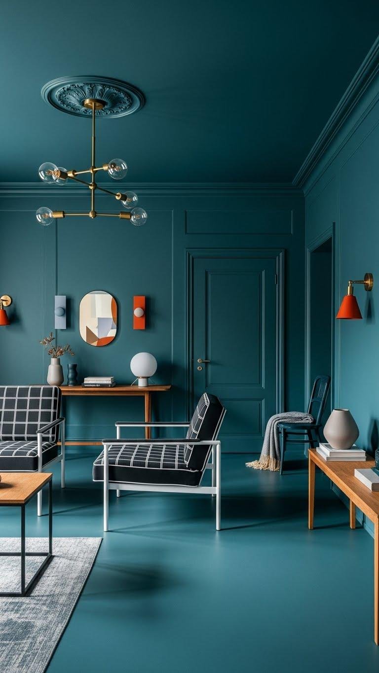 Plunge into color drenching to give your apartment an instant mood—paint walls, ceilings, and trim the same saturated hue so surfaces melt into one immersive backdrop. You’ll feel liberated choosing daring tones, pairing saturated ceilings with muted accents. Keep furniture simple: monochrome upholstery, clean lines, metallic or wood highlights. The result’s bold, cohesive, and revivingly personal—no fuss, pure impact.