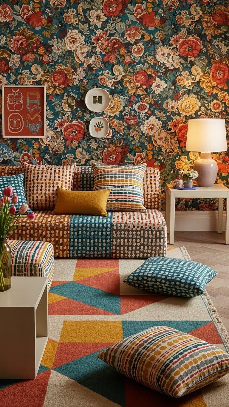 A few bold prints can energize a room, but you’ll keep it grounded by pairing them with neutral anchors—think a cream sofa, warm-white walls, or light-wood flooring—that let pattern sing without overwhelming the space.